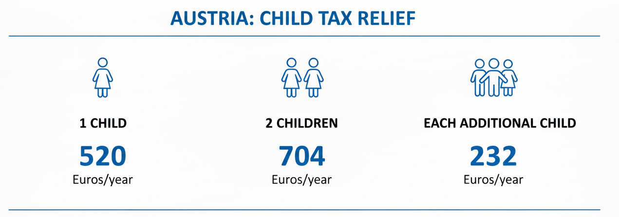 Single-income households may qualify for the Relief for Sole Earners if one partner earns little or no income and the family receives Familienbeihilfe (family allowance) for at least six months of the year. To qualify, couples must be married or cohabiting for at least six months, and the lower-earning partner must earn no more than €6,312 annually. The tax relief increases with the number of children. For a single child, the tax relief is €520; for two children, €704; and for each additional child, €232. Certain tax-free payments, such as overtime and childcare allowance, are excluded from the income limit.