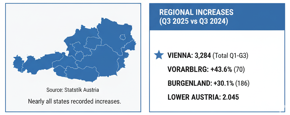According to Statistik Austria, at the federal-state level, nearly all states recorded increases in naturalisations in 2025 compared to the same period in 2024. The most significant relative gains were in Vorarlberg (43.6% to 70), Burgenland (+30.1% to 186), and Lower Austria (+28.5% to 2,045). In total, the highest number of citizenship approvals in the last nine months is in Vienna, with 3,284.